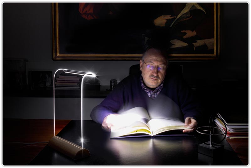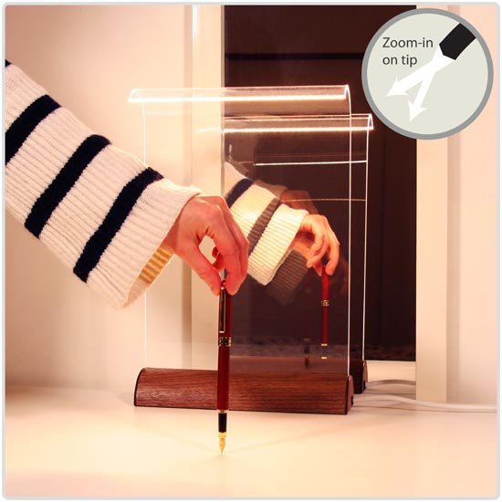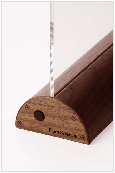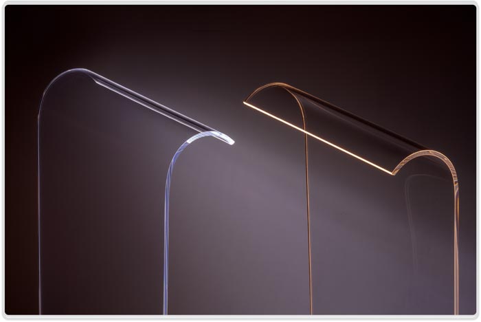 hidden in the wood base send light through a curved transparent acrylic plate, which gently shines from its tip.