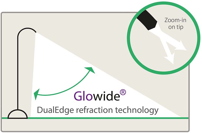 Guiding light inside transparent fibres underpins optical communication technology. Using the same physical principles, Glowide guides light from an array of high-brightness LEDs mounted in an aluminium base through a curved acrylic plate, minimizing light leakage and dazzle, in order to illuminate your work space optimally and with enhanced uniformity. Glowide is design-patented in 35 countries.